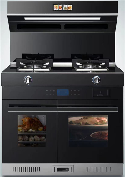 LED照明、电加热清洗、头部加热置物台、内腔冷凝玻璃、烟机联动、6.8英寸多媒体彩屏、单电机一体风箱、上进风火燃烧系统、发光旋钮、左烤右蒸